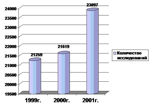 В 2001 году практически увеличилось количество всех исследований равномерно. Больше стало проводиться полостных исследований (трансвагинальные и трансректальные), доплеровского исследования сосудов.