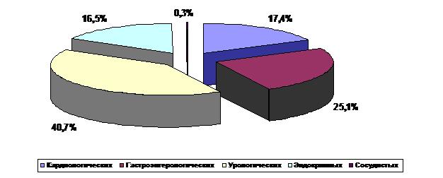 На данной диаграмме видно, что преобладает электрокардиография, так как это самый популярный и доступный метод исследования дающий ценную информацию. Реовазография — очень популярна среди хирургов, так как помогает дать информацию об аортальном кровотоке сосудов нижних и верхних конечностей. Следующий по популярности назначаемых исследований является спирография. Довольно редко применяется велоэргометрия для исследования сердечно-сосудистой системы (скрытая коронарная недостаточность, нарушения ритма, определение функционального класса стенокардии.)
